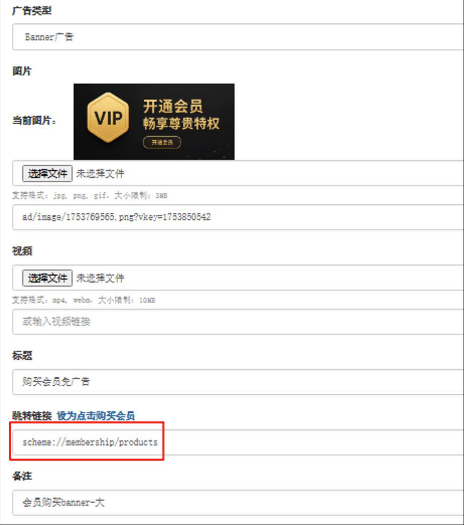 把链接设为指定URL就能在app内唤起VIP购买页面,可点击“设为点击购买会员”快速设置