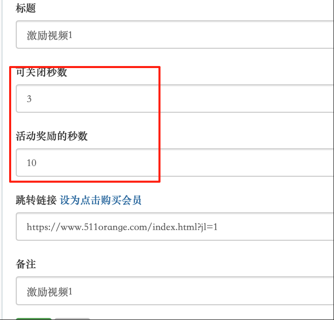 激励视频新增可关闭广告秒数、获取奖励秒数;如图设置代表三秒后可以关闭广告但无奖励、10秒后关闭则可领取奖励