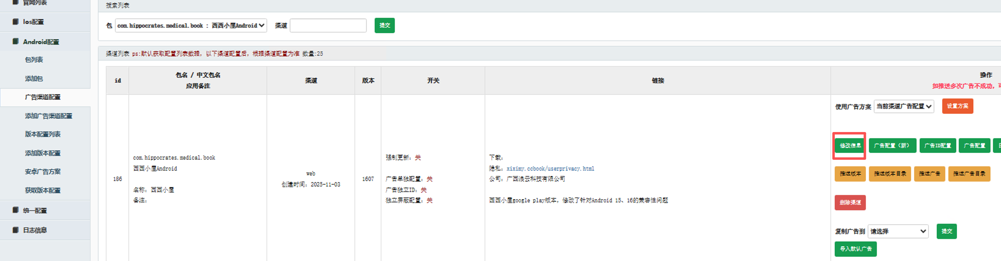 A:安卓渠道记录了旧的结果,需要手动更新一次渠道;找到对应包的渠道点击修改保存即可。