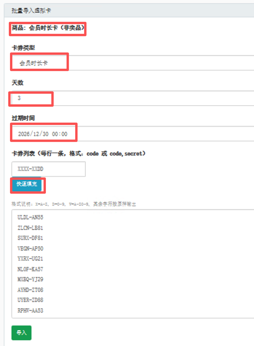 - 按模板导入卡号、卡密、面值、过期时间