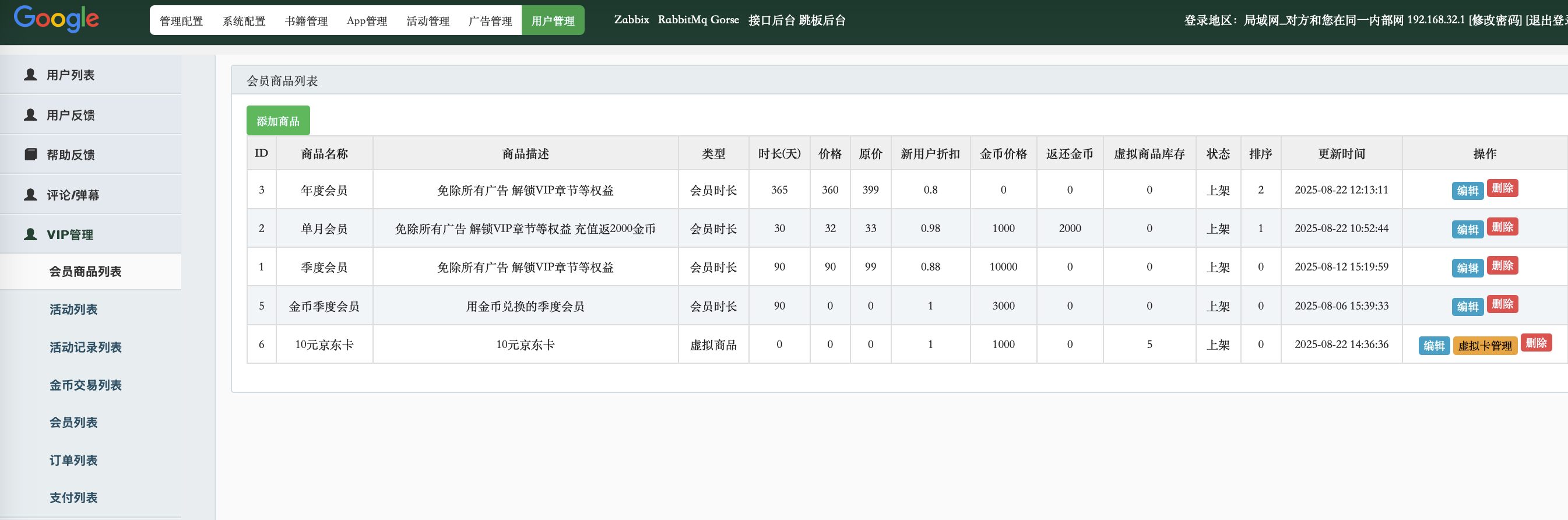 - 类型:会员时长 / 金币充值 / 虚拟商品
