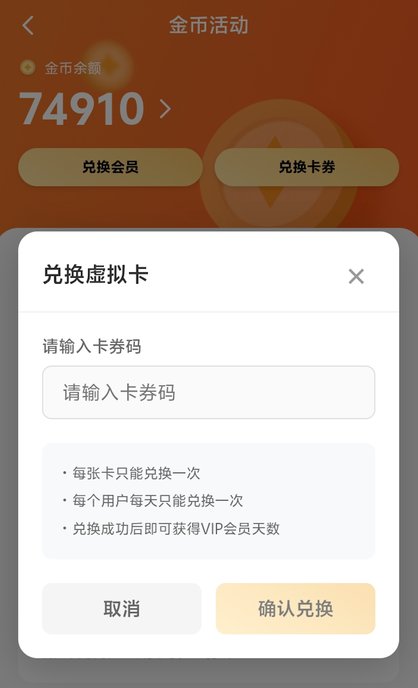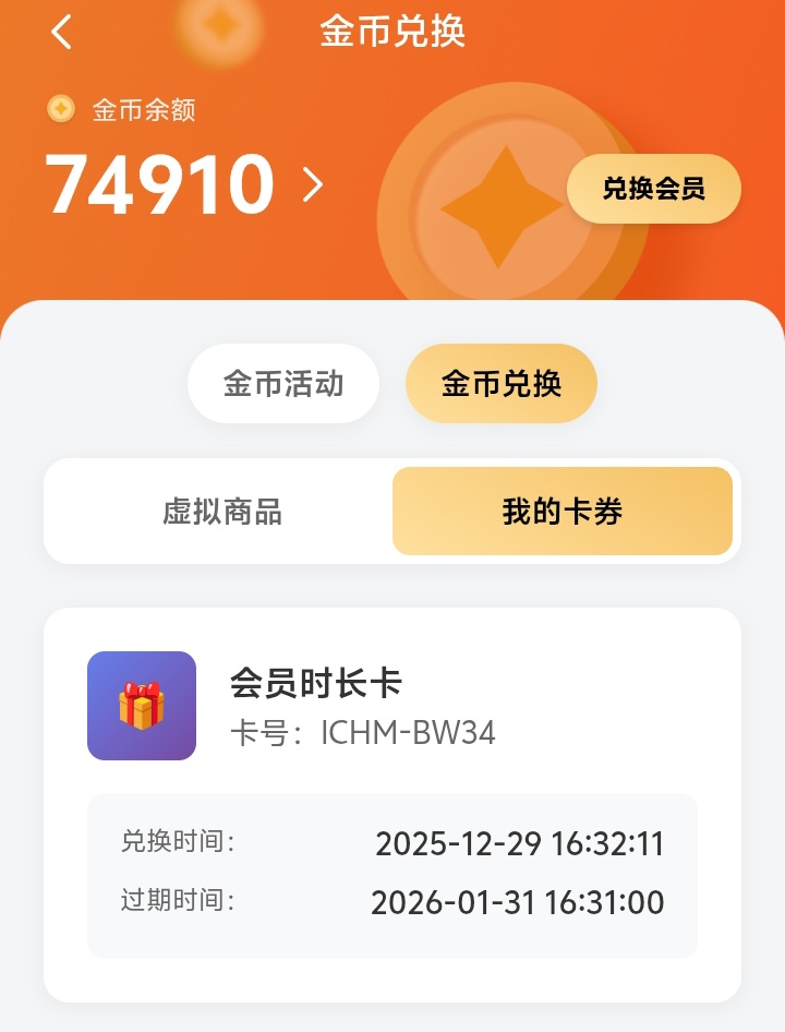 - 金币兑换页展示“虚拟商品”列表与“我的卡券”页签